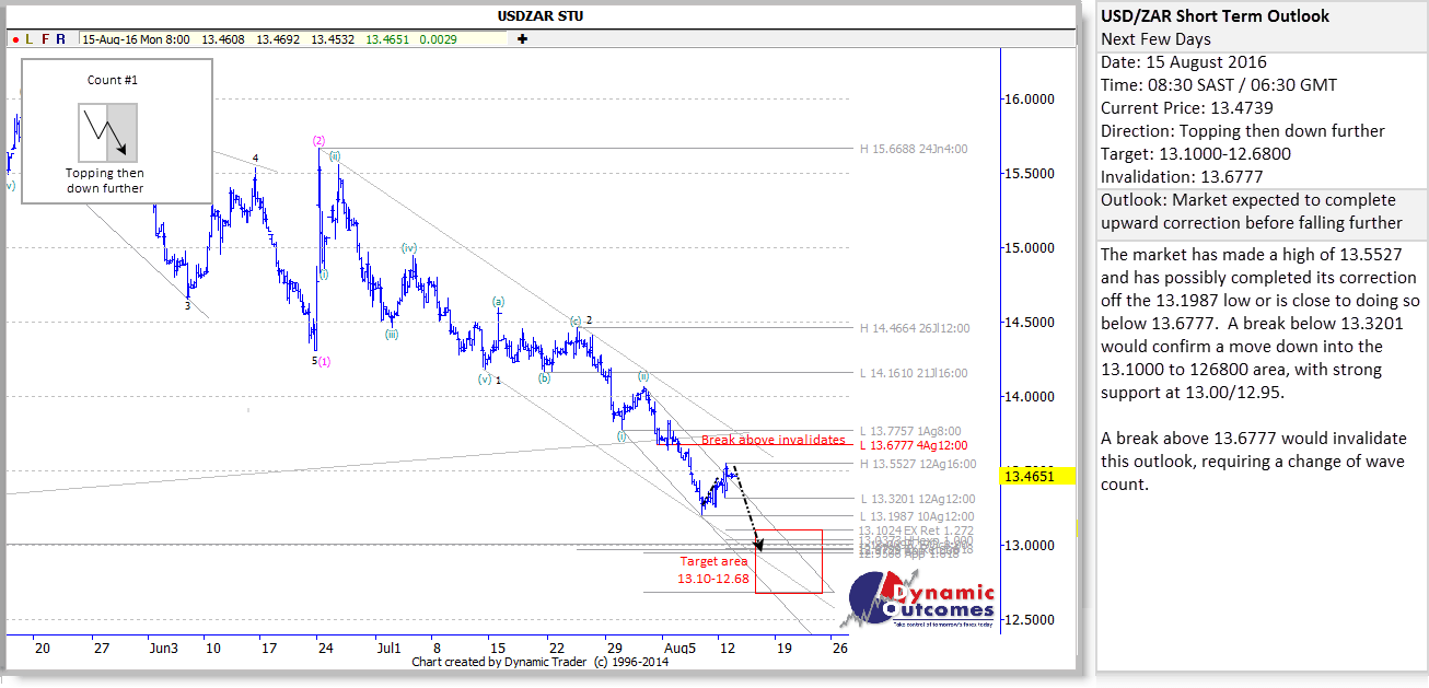 !USDZAR STU 20160815 pm2 We saw exactly that on Monday, as 13.48 was the high for the day, as the Rand steadily strengthened strongly throughout the morning and then afternoon.