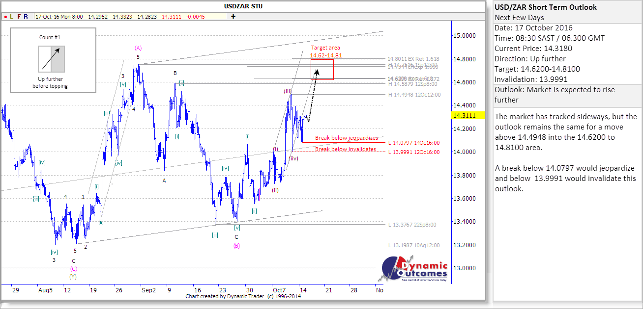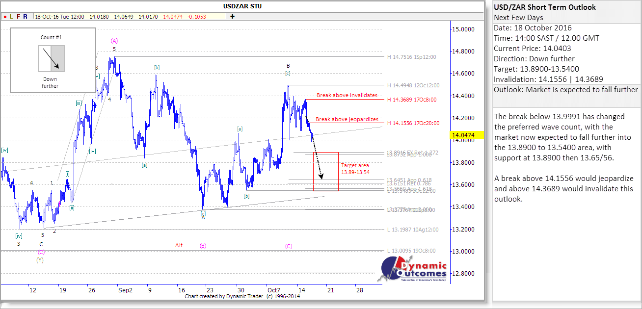 !USDZAR STU 20161017 pl8 Soon after, Rand was out of the blocks like a tracer bullet but not in the expected direction, as it moved against the preferred outlook forecast, and instead went with one of the other 2 wave counts we had running simultaneously (in hindsight, we should have included these alternate counts, but the probabilities were pretty low).