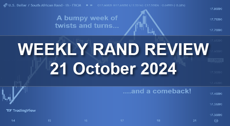 !A week of twists and turns and a comeback for the Rand (ZAR) vs USD 20241018-vs-USD_20241018.png) To keep abreast of the Rand's gyrations, view our live rates chart.Friday: The Comeback Kid Just when we thought the Rand was down for the count, Friday brought us the comeback story of the week. Opening at R17.66/$, we saw immediate strength Rand strength. By mid-morning, the USDZAR had dropped to R17.57. And we didn't stop there as it pushed still lower to hit R17.54/$, before settling at 17.59 at the close. A solid 0.30% stronger on the day, and a much-needed boost to end the week. And yes, once again, another satisfying win for our forecasting service.