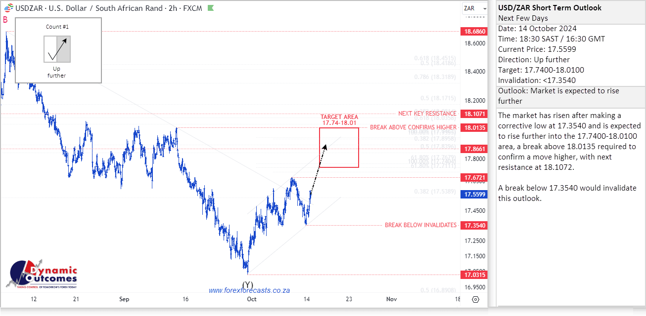 Key Moments (14-18 Oct 2024): Some of the more pertinent headlines and events over the past week: - SARB Monetary Policy Review: Inflation is slowly returning to targets with slight growth expectations - Eskom's R200 Billion Debt: Eskom's debt has once again come under the spotlight - ECB's Rate Decision impacts global currency markets - Middle East Escalates: The killing of Hamas leader in Gaza by Israel put a new twist to the ongoing war. *Monday: SARB Anticipation Sets the Stage* The Rand opened at 17.37 against the greenback, showing early jitters as traders positioned themselves ahead of SARB's Monetary Policy Review. Throughout the morning, we saw tight trading ranges, with the USDZAR pair hovering between 17.35 and 17.38. But as the day wore on, volatility and speculation began to build... ...by mid afternoon, we'd pushed up to R17.58/$, and then saw further weakening in after hours trade before the Rand found some fight to close the day at 17.52. Not the start most were hoping for, but the real action was yet to come if our forecast from Friday was to believed... ...which expected a move up into the R17.74-18.01 area over the coming days...see below